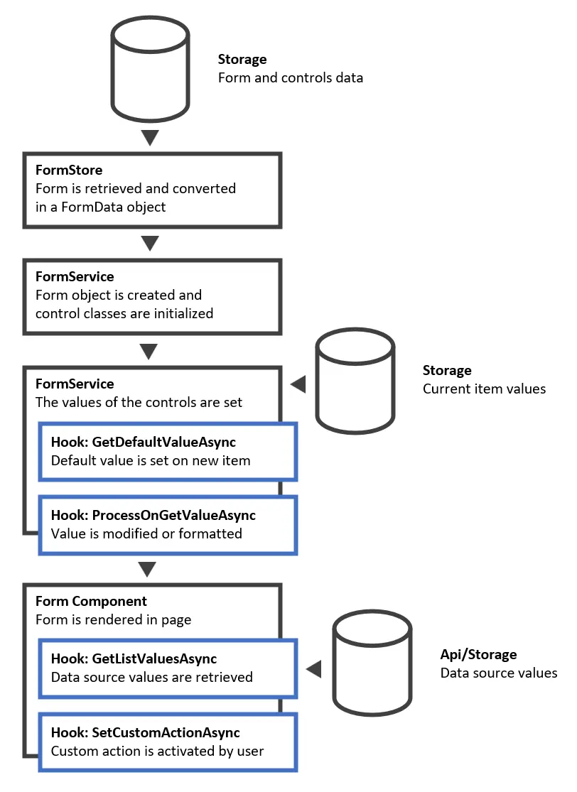 Il dato Json viene recuperato dal database attraverso FormStore e processato da FormService per creare un'istanza Form con la collezione Controls di elementi Control declinati nelle varie classi concrete (TextBox, Label, DropDownList e così via).